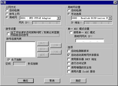每台计算机在安装SyGate4.0时,均要选择服务器模式(Server mode),并通过SyGate管理器(SyGate Manager)的“配置(Configuration)”菜单对它作如图3设置(假设计算机的网卡为Realtek RTL8139)。