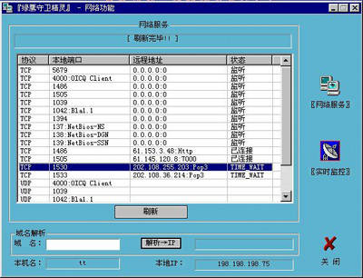 当然使用这款软件来保护自己的网络安全还是太麻烦,每次都要刷新一遍。后来笔者使用了一款国产的安全软件──绿鹰PC万能精灵来监控自己的网络安全,感觉要方便得多。其主要功能在于防止病毒与木马对系统的危害,辅之以一些Windows优化的功能与QQ聊天伴侣。其服务对象主要还是定位于经常使用网络的朋友。大家可去http://www.cnlvker.com下载使用。按下“网络服务”这个按钮可供你查看自身电脑各种端口的使用情况,并会对相应端口进行监听(图2)。笔者所开的QQ相关的协议连接都显示在上面。按下“实时监控”键可以对已经存在的连接进行实时监听以保证系统的安全性。