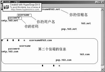 网络邮盘在首次使用时要求用户输入一个邮箱地址,并且在以后每次使用时,只要向邮盘添加一个信箱,邮盘就会自动向你首次使用时设置的邮箱发送信息,这个信息就是下次使用网络邮盘时要提取的信息。笔者猜想可能与添加的邮箱的用户名和密码有关。于是,笔者便进入信箱,拷贝名字为mboxinfo.dat的文件至硬盘。笔者试着用记事本打开,没想到居然打开了,而且其内容却让笔者吃了一惊(如图)。