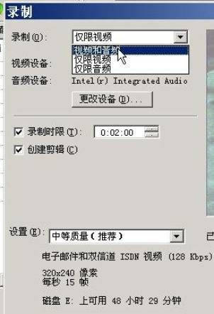 4.设置:选择“中等质量”后可以看到摄像的一些参数(如像素、每秒帧数等),以及硬盘空间来确定可以摄制的时间。当然如果你的硬盘比较大,则可以选择“高质量”。