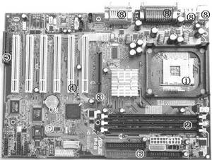 ①CPU插座:CPU就固定在此插槽上。②内存插槽:内存条就插在此插槽上。我们可以通过增加内存条来增大内存。③AGP插槽:靠近CPU的棕色插槽,主要用来连接AGP显卡。④PCI插槽:AGP插槽旁边的白色插槽,比AGP插槽稍长,是数量最多的扩展槽,主要用来插声卡、网卡等PCI设备的。⑤AMR插槽:在主板边上,长度大约只有PCI插槽的一半,用于连接一些AMR设备,如调制解调器(③④⑤统称总线扩展槽)。⑥驱动器接口:软驱、硬盘、光驱等设备就是通过数据线接在主板的驱动器接口上的。⑦主板电源插座:接机箱电源的主板电源插头,为主板提供电能。⑧输入/输出接口:详见本版左下角的“I/O接口”部分。⑨BIOS芯片: BIOS(Basic Input/Output System,基本输入/输出系统),是一组固化到主板上的一个ROM(只读存储器)芯片中的程序,它保存着最重要的基本输入输出程序、系统设置信息、开机上电自检程序和系统启动自举程序。⑩电池:在主板断电期间维持系统CMOS的内容和主板上系统时钟的运行。