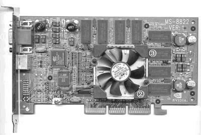 ①接口:接显示器的信号线插头。②芯片:在图中的风扇下面,负责图像处理工作。③显存:是存放图像数据的地方。