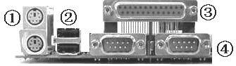①PS/2接口:接鼠标和键盘。②USB接口:接使用USB插头的设备。③COM口:接使用COM口的外部设备。④并口:接打印机、扫描仪等设备。