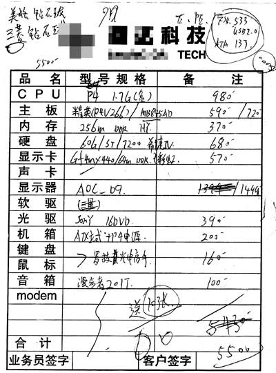 随后,我们来到重庆最大的装机商的配机店(它同时也有自己的品牌电脑)。在这张配置单中,我们选择了Athlon XP的平台。Athlon XP 1700+/1800+采用了新的0.13μm工艺,发热量和超频性能都有更好的表现。在整套配置中,显示器我们选择的是飞利浦150S3F(LCD),价格要2799元,之所以选择它是因为当时商家店里的大幅标语提示正在搞促销,送飞利浦的无线光电鼠标和蓝科火钻16MB优盘,笔者正是看中了前者。