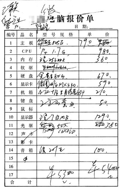 从报价来看,大部分的产品的报价与其他配置单的报价相差不是很多。不过,小编们发觉他的七彩虹GF4 MX440 64MB DDR报价有点高,居然要590元。后来到其他装机店才发现这种显卡普遍报价500元不到。一块显卡就要赚近100元,是不是太黑了点?
