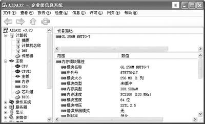 当然,要检测内存,这是远远不够的,直接读取内存SPD信息吧。选择“主板→SPD”(图2),可以检测的项目有:“模块名称(内存芯片生产厂家,如笔者这条为GL-256M)”,“模块大小(内存容量)”,“内存类型(SDRAM还是DDR)”、“模块宽度”(内存宽度)、“内存速度(本机为PC2100)”。此外,还可以读出本内存在不同外频下的速度(如笔者的内存经检测:在CL设置为2时,可以7.5ns速度运行于133MHz外频下;CL设置为2.5时,可以7.5ns速度运行于133MHz外频下,可断定为正品PC2100)。同时,AIDA32也能侦测出你的内存所支持的所有功能。怎么样,想知道的都知道了吧,还怕碰到打磨内存条么?