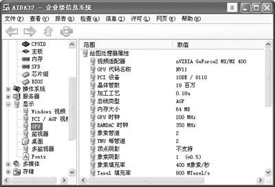 这两年,随着3D技术的发展,显卡的更新换代越来越快,分类也越来越细,这就给了JS们可乘之机:TNT2 Vanta冒充M64,MX400冒充MX440;显卡性能指标缩水也时有耳闻,而AIDA32的显卡检测就可以让你避开这些假货和缩水货。