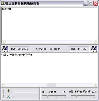 在这个聊天窗口的下部,还可以设置音箱、话筒的音量,最大延迟时间(即如果声音数据在最大延迟时间内无法传到对方,则放弃传送,在带宽比较窄时避免数据拥塞)等。