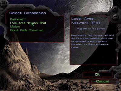 2.在进入联网游戏类型的选择界面后,单击“Local Area Network [IPX]”项选择局域网连接方式,再单击“OK”按钮进入局域网战网的登录界面(图1)。