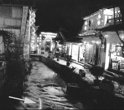 如图9,是在云南丽江古城拍摄的夜景,使用Canon PowerShot Pro 90数码相机。所要拍摄的场景是河道两边的建筑物,有一定的纵深。为了使近处的景物和远处的景物都比较清晰,就必须有一定的景深范围,因此光圈的设置不能太小。这个时候,我们应该采用光圈优先曝光模式(AV),首先设定合适的光圈。在此例中,光圈设定为f5.6就可以保证满意的景深范围。在AV模式下,相机就会自动设定曝光时间,在当时场景的光线环境下,曝光时间大约为2秒。在这个快门速度下,手持相机拍摄是不行的,必须使用三脚架。因为当时没有随身携带三脚架,所以就将相机稳妥地放在石桥的栏杆上进行拍摄。从照片可以看出,这种方法是可行的。前面提到过在黑暗的场景下,相机的自动对焦可能会失效,所以在进行拍摄的时候,选择了较明亮的近处房屋进行对焦,待锁定焦点后重新构图拍摄。