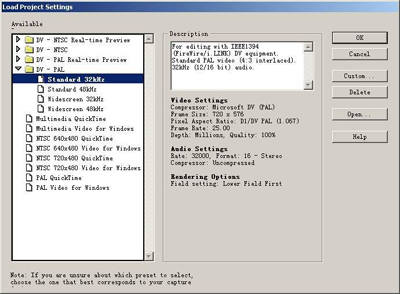 启动Premiere 6.5,弹出“Load ProjectSetting”方案预设置对话框(图1)。