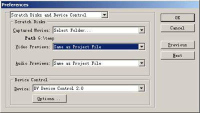 首先来设置视频和音频文件采集后的保存位置。执行主菜单“Edit/Preferences/Scratch Disk and Device Control”命令,弹出参数设置窗口,在Captured Movies右侧的列表框中选择“Select Folder”命令选项,在弹出的对话框中选择视频和音频采集后文件保存的位置(图2)。