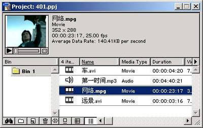 启动Premiere 6.5并建立一个新的项目文件。在项目窗口中单击鼠标右键,并在弹出的菜单中选择“Import/File”命令,然后在弹出的对话框中,选择导入已经准备好的剪辑文件“远景.avi”、“网络.mpg”、“第一时间.mp3”几个素材剪辑,并导入到项目管理窗口中(图1)。