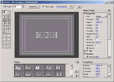 执行主菜单“File/new/Title”命令,打开字幕编辑器,选择工具箱工具按钮,在屏幕安全区域中输入文字“第一时间”。然后选择工具按钮,将文字框移动到屏幕中央。在右侧的参数面板中,选择字体(Font)为黑体(Simhei),选择字体颜色为白色(图2)。