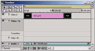 在项目管理窗口中,选择剪辑“网络.mpg”并放置到Video 1B轨道中,并与剪辑“远景.avi”剪辑重叠1秒。然后在过渡窗口中选择剪辑“Iris/Iris Star”过渡效果放置在过渡轨道,两个剪辑重叠位置,这样在两个剪辑重叠处就产生了网格划像方式。
