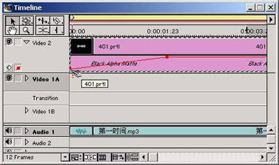在Timeline窗口,单击Video 2轨道右侧的下三角形按钮,展开Video 2轨道。接下来为字幕剪辑增加淡入效果。在展开后的红色控制线左侧2/3处单击一次鼠标左键产生一个控制点,然后单击字幕起始位置控制点,并拖到轨道最下方(图4)。