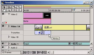 通过前面的设置,在两个剪辑重叠处产生了片断飞入的划像效果。