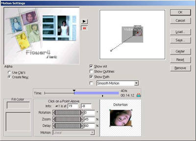 用鼠标右键单击“运动”剪辑,然后在弹出的快捷菜单中选择“Video Options/Montion”命令,弹出运动设置对话框。单击“Start”起始点,设置Info起始点坐标为(-80,60)、Zoom值为100%。单击“End”结束点,设置Info起始点坐标为(19,-8)、Zoom值为45%、Delay值为60%,完成设置后,单击OK按钮返回(图7)。