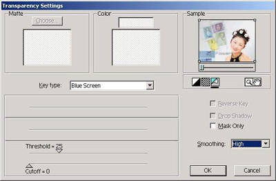 在“Key Type”下拉列表框中选择“Blue Screen”选项。拖动“Threshold”滑块,并将它的数值设置为25,使当前剪辑产生半透明效果。拖动“Cutoff”滑块,将它的数值设置为0,从而屏蔽人物背景的蓝色,同时在“Smothing”下拉列表选项中选择“High”,完成设置后单击“OK”按钮返回主界面窗口(图8)。
