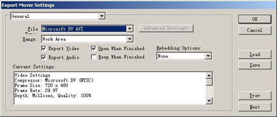 首先要选择输出的文件类型,单击导出设置窗口中“File”右侧的下拉列表框选项,在这里有可以输出的各种文件格式的类型,比如“Microsoft DV AVI”。Premiere可输出的电影格式有:AVI电影、MOV电影、GIF动画、Flc/Fli动画、TIF图形文件序列、TGA图形文件序列、GIF图形文件序列、BMP图形文件序列等。同时选定“Export Video”和“Exoprt Audio”选项,以输出视频轨道和音频轨道上的内容,不选则不输出。如果选中“Open When Finished”选项可以在视频输出后,播放视频输出效果(图1)。