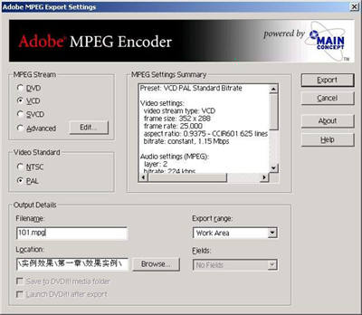 在Adobe Premiere 6.5中,新增了可供制作VCD、SVCD、DVD影片的MPG文件格式。编辑并制作好影片后,执行主菜单“File/Exoprt Timeline/Adobe MPEG Cod er”命令,弹出“Adobe MPEG Coder Setting”导出电影文件对话窗口。比如我们打算输出一个可以用于制作VCD光盘的MPG格式文件,可以在“MPEG Stream”中选择“VCD”单选框,同时在“Video Standard”中指定导出的影片为PAL制式。完成后,在“Filename”中输入影片的名称为“101.mpg”,单击“Location”右侧的“Browse”按钮,选择文件保存路径,完成以后单击“Export”按钮(图3)。