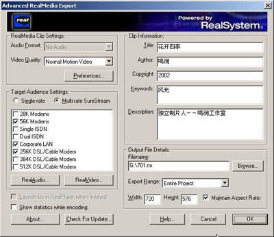 弹出“Advanced RealMedia Export”设置对话框。在“Video Quality”下拉列表中选择视频发布的质量,这要根据网络传输的速度来决定,一般可以选择“Normal Montion Video”选项。在“Target Audience Settings”列表框中选择网络连接类型,一般选择多种连接方式,这样可以适应更多的网络用户需求,选中“Multi-rate SureStream”方式,然后在下面的列表中选择允许的网络连接类型,比如56Kbps Modem、LAN、xDSL/Cable Modem等常见的网络连接类型。接下来,还可以根据自己的需要在“Clip Information”中输入剪辑片断的标题(Title)、作者(Author)、Copyright(版权)、关键字(Keywords)、说明(Description)等相关信息。在Filename文本框右侧单击“Browse”按钮选择文件的保存位置,并在Filename中输入文件名称,最后单击“OK”按钮即可将文件导出并保存为RM格式文件了(图4)。