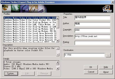 执行主菜单“File/Export Timeline/Advanced Windows Media”命令,弹出“Windows Media 8 Export Plug-in for Adobe Premiere”对话框。在“Profiles”列表中选择网络的发布类型,并在“Properties”选项中设置好与流媒体文件相关的参数,比如作者、版权信息、说明等,同时在“Destination”中设置好WMA文件的保存路径和名称(图5)。