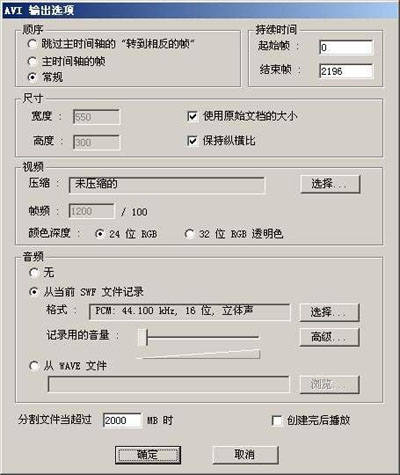 在其主界面(图1)选择“文件”菜单中的“打开”命令将它导入SWF文件,窗口中其他的菜单并没有太大的意义,可直接在“文件”菜单中选择“创建AVI”,将文件命名保存。最后会弹出一个“AVI输出选项”窗口(图2),主要的设置在这一步完成。在顺序和持续时间可按默认设置;尺寸必须要修改,因为SWF的原始尺寸和合乎视频的尺寸相距甚远,可去掉“使用原始文档的大小”前的钩,将宽度和高度改成适当的数值(如VCD的352×288);视频压缩可根据需要来选择适当的AVICodec进行压缩,想节省空间不妨使用DivX啦。做VCD可选择None非压缩方式;音频只提供了一种PCM格式,可按“选择”来设置其采样频率,另外也可导入外部的WAVE文件作为音频。最后点击“确定”即开始创建AVI文件。