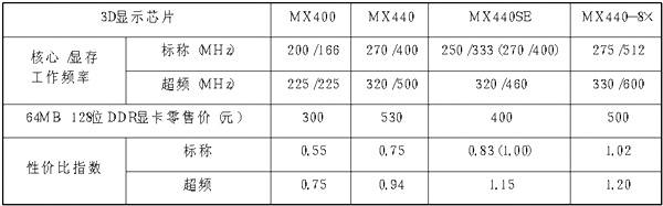 经过计算我们列出附表以估算配备64MB128位DDR显存的MX440、MX440SE、MX440-8×显卡的性价比差异,相信不必我解释,普通用户和超频狂人都能轻松找到自己的最爱。(作为对比的GeForce2MX400由于核心设计是古老的“2”代,因此这样对比MX400会占不少便宜,因此仅供对比MX440系列时的参考之用。)