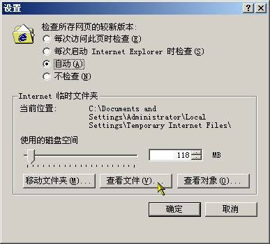 5.在IE中选择“工具”菜单里的“Internet选项”,在“常规”选项卡中,单击“设置”按钮,此时会弹出一个“设置”对话框,单击“查看文件”按钮(图1)。