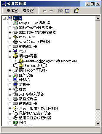 2.如未出现该标志,检查系统的红外功能是否启用。值得注意的是未加红外线驱动补丁的电脑也能有以上显示,因此在进行下一步前,请先打开电脑的“设备管理器”,在调制解调器中查看是否多了一个名为“Siemens S45”的项目(图2)。如果有,可进行下一步的操作。