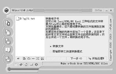 如图1所示,只需按开始处理按钮,即可将要转换的文件转换为palm可读的pdb文件。同时还支持快速转换模式,可以从剪贴板直接粘贴文本到文本框或手工输入后直接转换。
