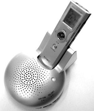 这款产自韩国的MSCVR-S1150U数码录音笔使用一节AAA电池,录音时间可以达到7小时。它的内部闪存容量为32MB,录音分为3个档次,超高清晰度的SHQ模式下可以录下140分钟的语音;高清晰度HQ模式下700分钟,压缩模式LP下可以录下长达1140分钟的语音。MSCVR-S1150U数码录音笔也提供了FM收音功能,你就可以随时录下FM收音机中的语音文件。这款MSCVR-S1150U数码录音笔给人最深刻的印象就是多了一个球形的底座,拥有两个RJ11电话线接口,将底座上放入录音笔就可以实现电话录音了。此外,底座还可以当扬声器使用,你所录下的语音直接就可以在底座上播放,声音宏亮而清楚。