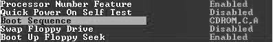 用可以开机的光盘,咦,什么是可以开机的光盘呀?!电脑商家在卖给你电脑时都会附带一张系统安装盘给你,例如Win98、WinXP安装盘,它们多是可以开机的光盘。但是因为大部分计算机默认的启动顺序先是A(软盘),接着是C(硬盘),最后才是CD-ROM(光盘),所以理所当然要设定光盘(CD-ROM)为优先启动了。设定方法为开机时按住“Del”键进BIOS→“Advanced BIOS Features”→设定“BOOT Sequence”为“CDROM,C,A”(图1),然后保存并退出BIOS(图2)。现在,你插入光盘,开始一般会有三个选项供你选择: