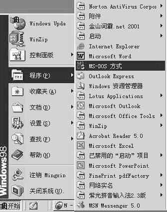 如果你的系统是Win98,进入DOS仿真模式方法为点击“开始”菜单→“程序”→选择“MS-DOS方式”(图4)。