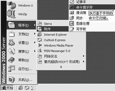 如果你想从Win2000/XP系统进入DOS仿真模式,点击“开始”菜单→“程序”→“附件”→选择“C:\>命令提示符”(图6)。