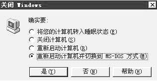 进入实模式的方法是点击“开始”菜单→“关闭系统”→选择“重新启动计算机并且切换到MS-DOS方式”(图5)。