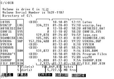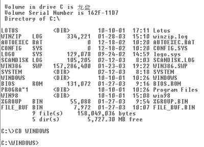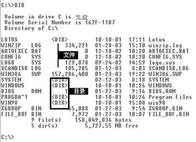 2.接着我们用DIR这条命令来查看C盘里是否含有“SYSTEM”这个目录吧。输入DIR命令后按回车键,会出现如图11的结果。其中带有“DIR”指的是目录,没有则是文件。你看,第八排含有“SYSTEM”这个目录了(没有?别急,只要输入MD SYSTEM再按回车键就可以新建一个此名的目录了。后面会讲到MD的用法)。