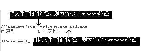 同前几期一样我们要先进入DOS状态。例如C盘Windows目录下有一个Welcome.exe文件,要把此文件拷贝为wel.exe文件,先进入 C:\windows目录,然后输入命令copy welcome.exe wel.exe,按回车键(图17),