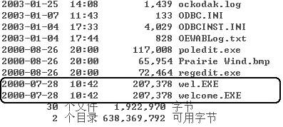 系统会提示“已复制1个文件”。好了,用dir windows命令查看此目录,该目录下就多了一个叫做wel.exe的文件啦(图18)。该目录并发现拷贝后的文件wel.exe就是welcom.exe的翻版,无论大小、类型都一样。