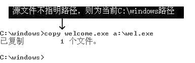 怎样将C:\windows目录下welcome.exe拷贝到软(A)盘根目录下成为wel.exe呢?如果你当前所在路径为C:\windows,运用法则套公式得到:copy welcome.exe A:\wel.exe,按回车键(图19)。如处在A盘根目录下则输入copy C:\windows\welcome.exe wel.exe。是不是真正拷贝上呢?可以用dir命令查看软盘里的内容。