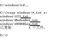 通配符有*(字符串通配符)和?(字符通配符)两种,“通配”的含义等同“代替”,可以代替文件名里的字符和字符串。通配符对Copy命令而言可同时拷贝多个同类型文件,如你要拷贝C:\windows所有扩展名是txt的文件到A盘根录,输入copy windows\*.txt A:(图20)。你看,是不是所有扩展名是TXT的文件都拷贝过来了?!如果我只要把扩展名是TXT且文件名的第二个字符为“e”的文件拷贝,那又该怎么办呢?!简单,可执行copy windows\?e*.txt A:。呵呵,通配符的功能看起来好像是万能的!