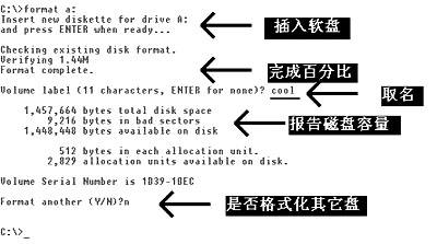 再来讲一条杀伤力更强的命令──FORMAT,它就是我们常听说的“格式化”。要在纸上写字,首先纸要是白纸才行,然后必须在上面打格子,然后才在这些格子里写字(这个叫分区,我们以后会涉及的),这个在磁盘上打格子的过程,就叫“格式化”。