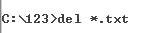 要删除当前目录中的某个文件,输入DEL空格再加上文件名就可以了,比如想删除123目录下3.EXT这个文件,进入到123这个目录,然后输入DEL 3.EXE回车即可(图23),如果要删除123这个目录里所有扩展名为TXT的文件,进入123这个目录里输入DEL *.TXT(图24)。删除该目录里的全部文件就更简单了,输入DEL *.*,系统会提示是否真的要删除所有文件,选“y”确认。