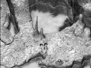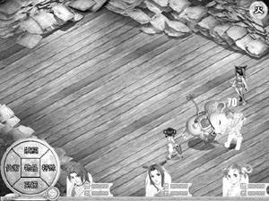 石头上的封印因为小虎的血而打开,两人进入洞穴,发现此处别有洞天,原来这里是一座陵墓,而怪物就盘踞于此。进入怪物的洞穴要找到四块大的石板。目前只有左下角的门敞开着,二人进入其中,走到漂浮着一块大石板的地方,进入战斗。敌人是两只鬼魂和一个大石板,两只鬼魂比较好解决,干掉它们后,让小虎疗伤,然后用苏媚的魔法攻击,一次打掉100左右的HP,几下就可以消灭石板,战斗胜利后得到绿色石板。