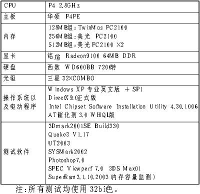 我们根据目前比较常见的配置情况,分三个档次进行测试:128MB、256MB、512MB。测试选用主流的DDR内存,统一工作在133MHz(等效于SDRAM的266MHz)频率下,CL值为2.5。为了贴近实际应用,整个测试根据用户类型分为两个部分:游戏性能测试、办公性能测试。其中标准游戏性能测试我们选用了《Quake3》和3Dmark2001SEBuild330,以及《UT2003》进行测试,同时还进行了《魔兽争霸3》和《战地1942》的实际试玩测试。办公性能测试我们选择了SYSMark2002进行测试,同时也进行了Photoshop 7.0和基于OpenGL的SPEC Viewperf 7.0中的3DSMax01项的实际渲染性能对比测试。