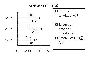 从图中我们可以非常清楚地看到,在使用256MB内存和512MB内存时,系统的性能测试得分十分接近,而在使用128MB内存时,系统得分明显要偏低40%左右。很明显,仅仅128MB内存在进行图像、网页设计以及大规模文字处理的时候,已经力不从心了,而256MB内存和512MB内存的得分接近,应该是测试软件仍然没有大量使用到256MB以上内存空间而导致的。