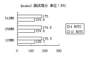 可以看到,128MB、256MB还有512MB内存在这个测试中,差别不是很明显,而BOT数量增加后,游戏帧率下降很快,但是增加内存后改善并不明显,可见此时瓶颈不在内存容量上了。对于《Quake3》这样比较旧一点的游戏,128MB内存也可以顺畅地运行,当然使用256MB内存可以避免游戏中偶尔出现的停顿。