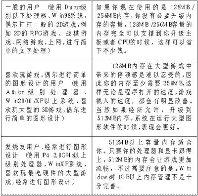 通过上面的测试,基本上可以得到这样的结论:128MB内存的配置无论是办公应用还是运行流行的游戏,都显得比较吃力了,甚至只是运行Windows XP,也稍嫌不足;256MB的内存容量可以很不错地应付目前常见的应用软件和大型游戏;512MB内存相对256MB内存来说,性能提升不是很大,但是在进行图形设计,还有运行最吃硬件配置的大型游戏时,优势还是明显的。