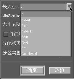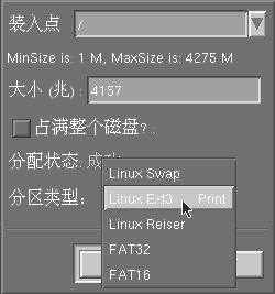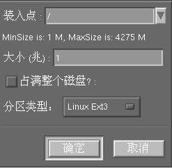 选择“/”为载入点,输入该分区大小(本例中为4150MB)并选择分区类型为“Linux Ext3”,点击“确定”,如图5、图6所示。